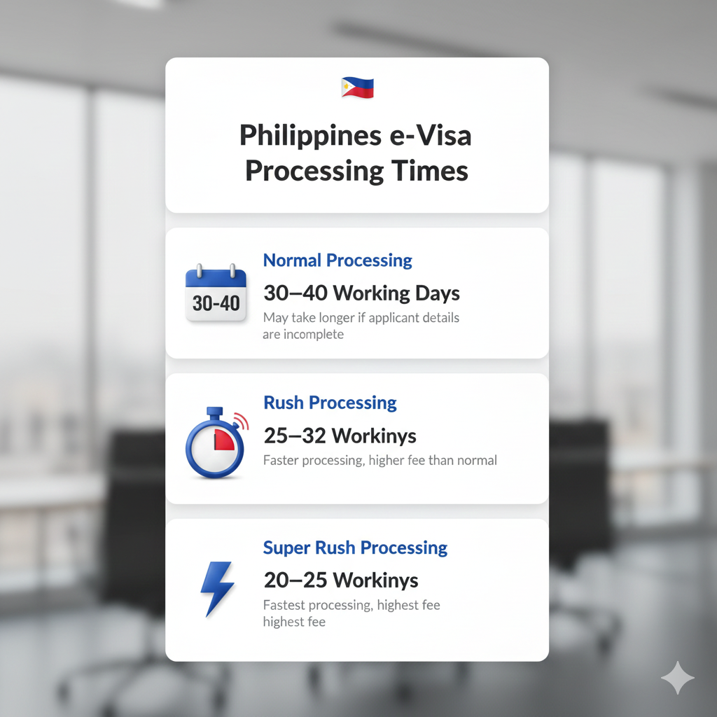 - Super Rush Processing: A super rush processing visa can be processed within 20-25 working days if the application form is complete and there is no missing information about the applicant. The super rush processing visa fee is charged more than the rush processing visa fee.