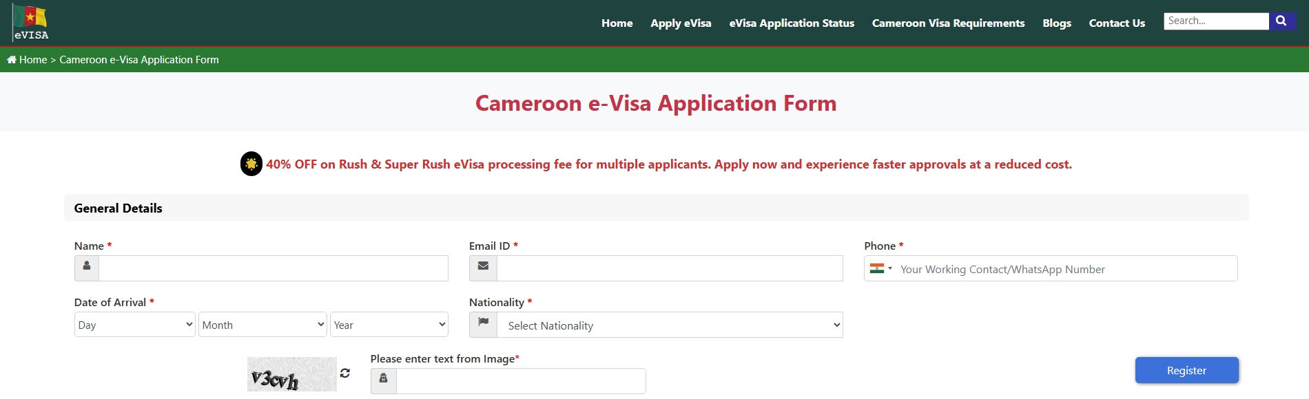 Fill in the online application form on the portal for Cameroon eVisa, entering personal and travel details.