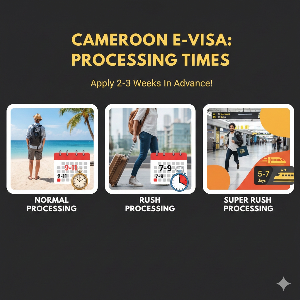 Super Rush Processing (5–7 Working Days): Fastest option with top-priority review for Cameroon urgent visa travel.
