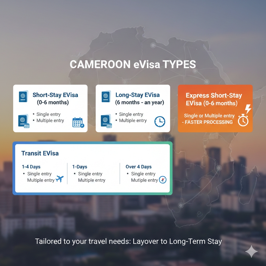 When traveling to Cameroon from Guinea-Bissau (or any other country), you have several Cameroon visa types to choose from. Your choice depends on how long you plan to stay, how many times you intend to enter Cameroon, and whether you’re in a hurry or have flexibility. Here are the main categories, along with their characteristics: