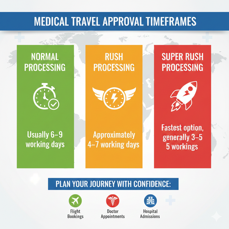 Applicants often need clarity about how soon they will receive their approval, especially when medical travel is involved. The durations available include: