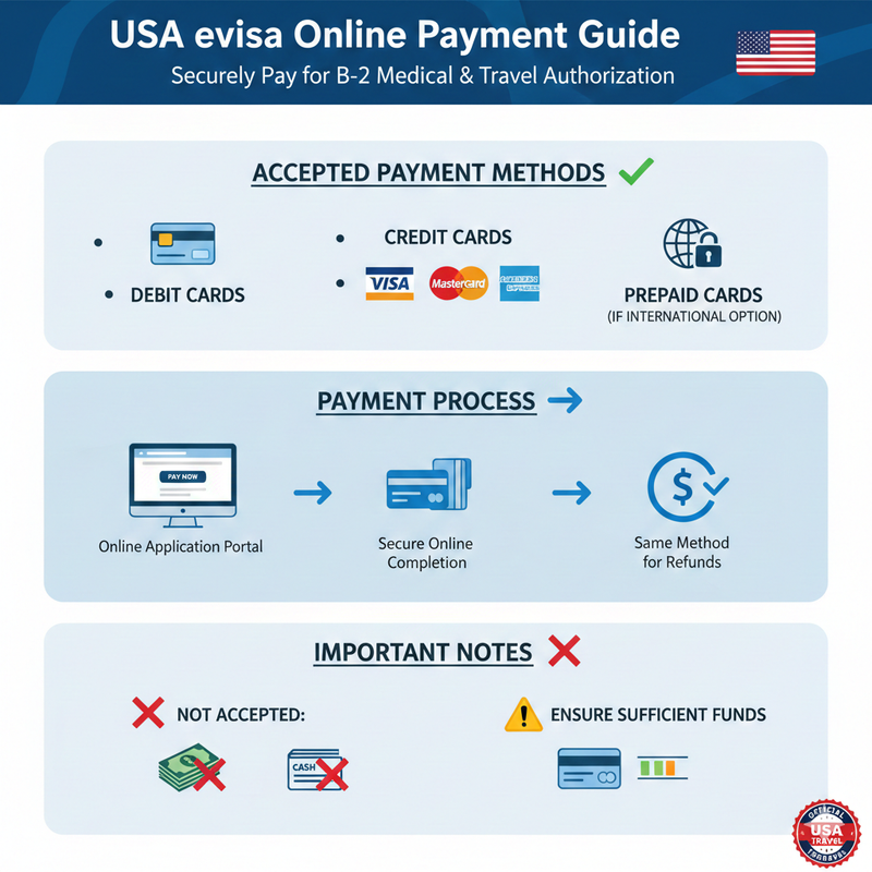 Most USA evisa applications, including medical travel via B-2 or travel authorisation, require online payment.