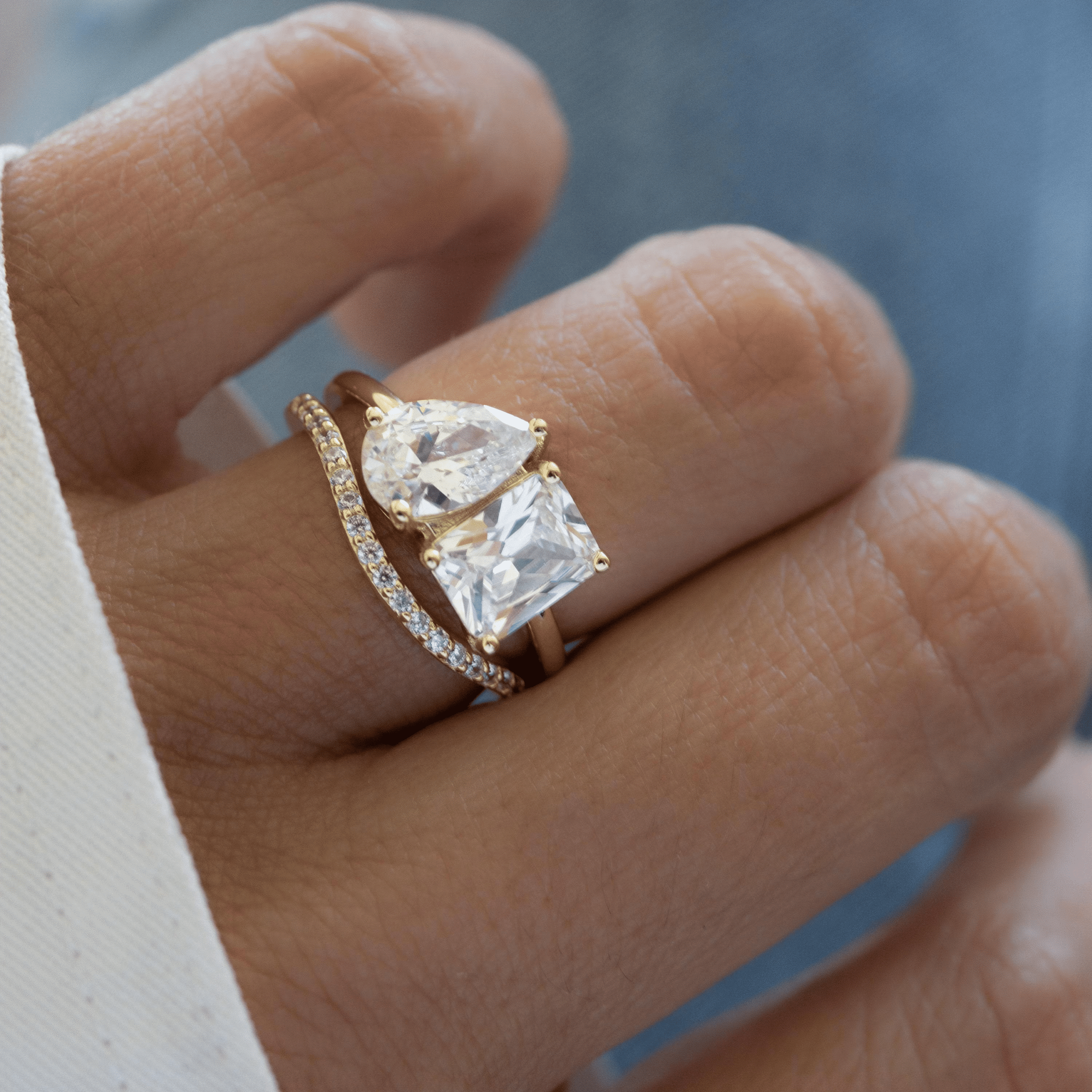 The two-stone setting already tells a story of duality and togetherness. Adding a wedding band enhances this concept by creating a balanced, cohesive look that flows naturally from engagement to marriage.